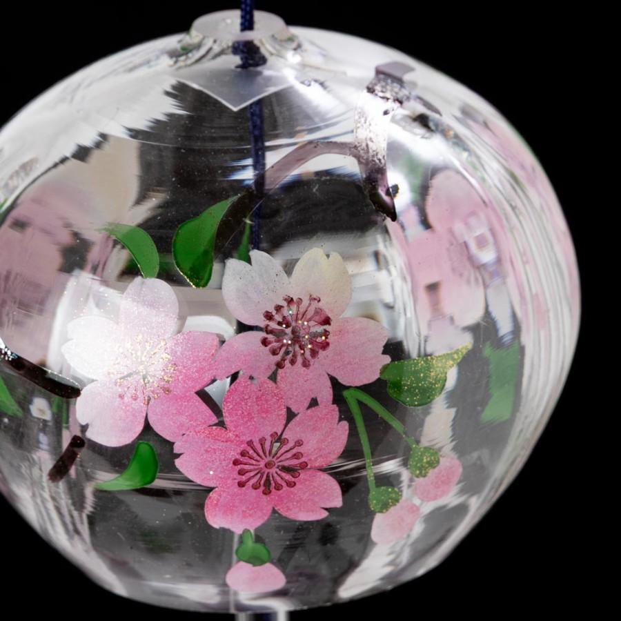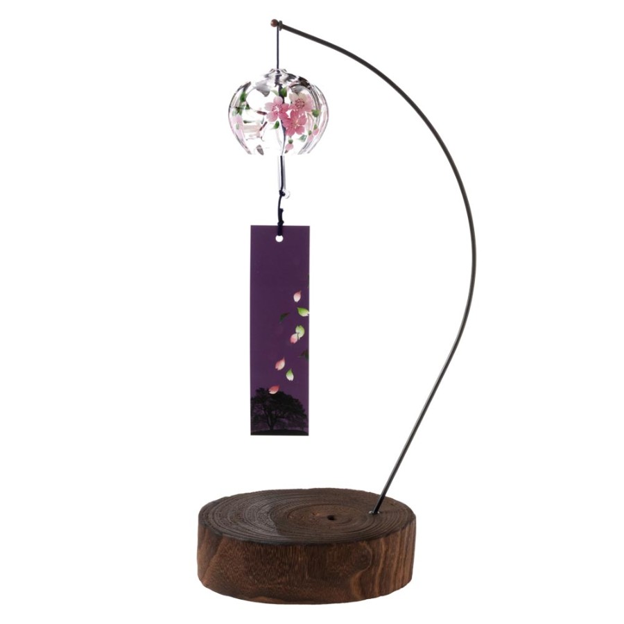 クリスタルガラスを使用した、ぬくもりのある透明感が特徴の風鈴に、その透明感を生かした柄を内側にさりげなく描いた、立体感のある柄のガラス風鈴。そこに、風鈴を吊るすスタンドをセットにしました。スタンドの台は桐材から作っていますので、木の暖かみが感じられる素朴な雰囲気が特徴です。軸は丈夫な鉄製で、安定して風鈴を吊るせます。