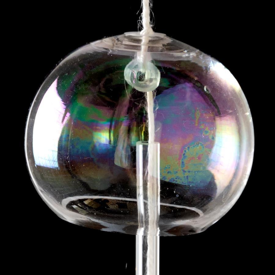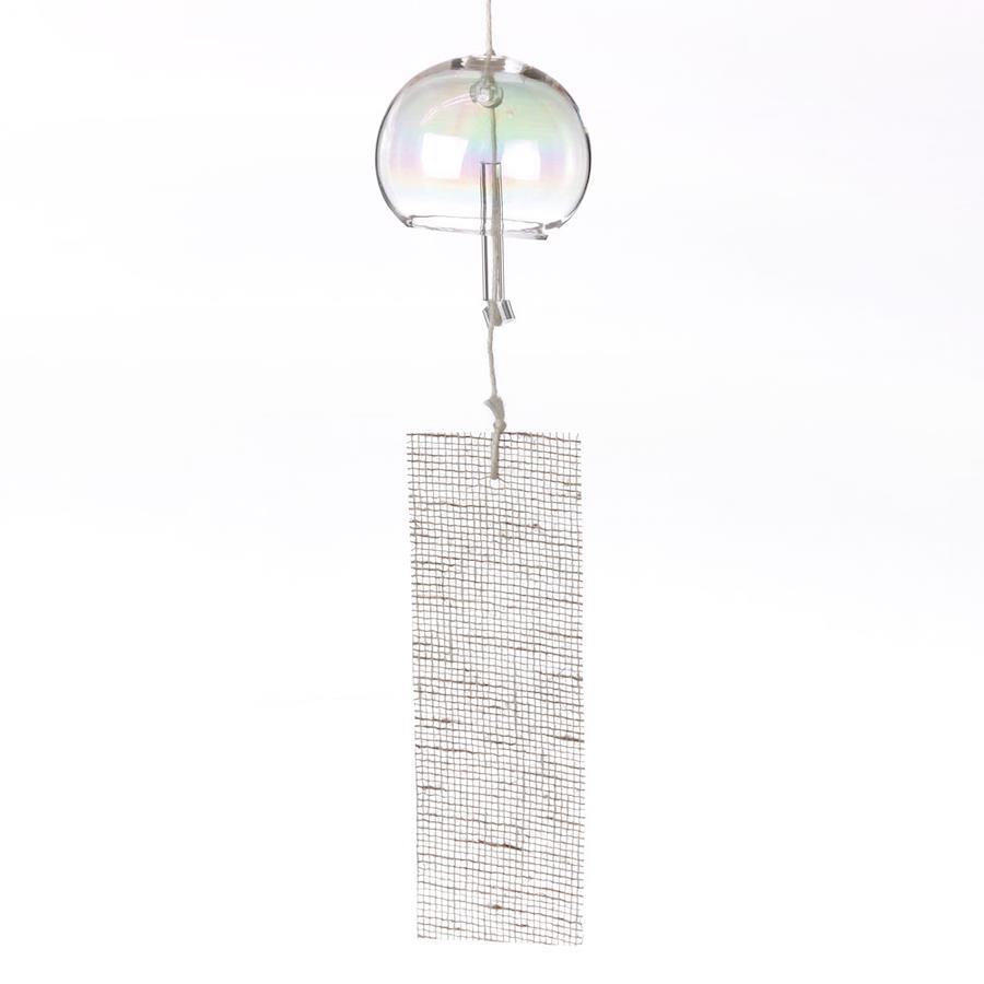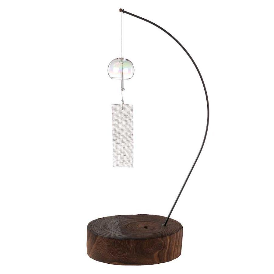 まさにシャボン玉。ここまでシンプルなのに、心を引かれた風鈴は初めてでした。かすみのような虹色の硝子を、そのまま丸い風鈴に。揺れる姿がシャボン玉をイメージさせます。そこに、風鈴を吊るすスタンドをセットにしました。スタンドの台は桐材から作っていますので、木の暖かみが感じられる素朴な雰囲気が特徴です。軸は丈夫な鉄製で、安定して風鈴を吊るせます。
