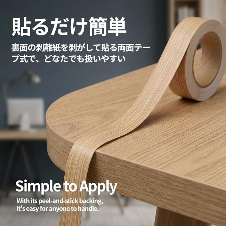 「細幅でちょっとした補修に」細め幅設計だから、テーブルや棚の小口・木口などちょっとした補修用途に合わせやすい。
