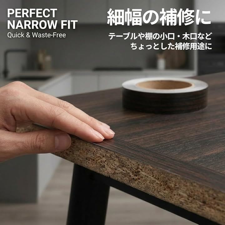 「細幅でちょっとした補修に」細め幅設計だから、テーブルや棚の小口・木口などちょっとした補修用途に合わせやすい。