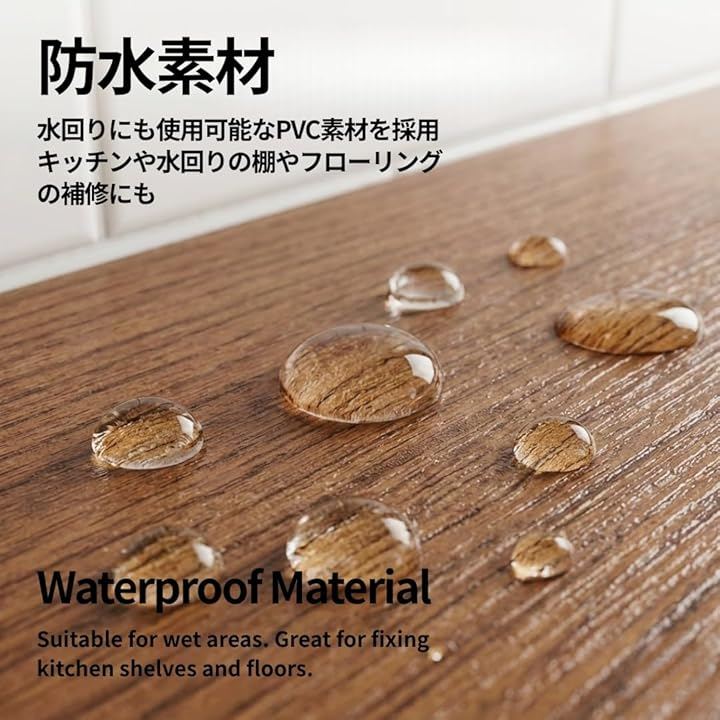 防水はもちろん、防油・防汚性も持ち合わせるため、キッチンや水回りの棚やフローリングの補修にもお使いいただけます。