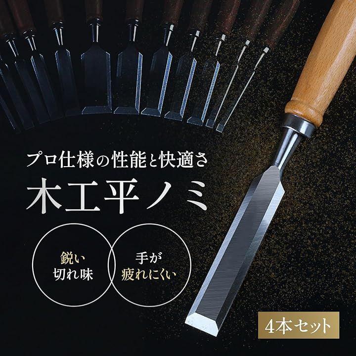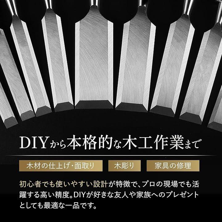 「初心者からプロまで使える多用途なノミセット」このノミセットは、木材の仕上げや面取り、木彫り、家具の修理、DIYなど、幅広い木工作業に対応できます。