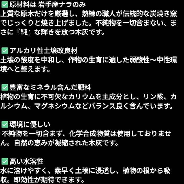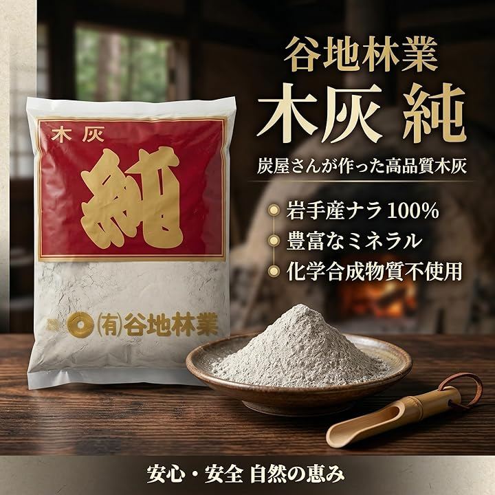 「伝統の品質」谷地林業の木灰 「純」は、岩手産の厳選された木材を使用し、職人による熟練の技で丁寧に生産された高品質木灰です。