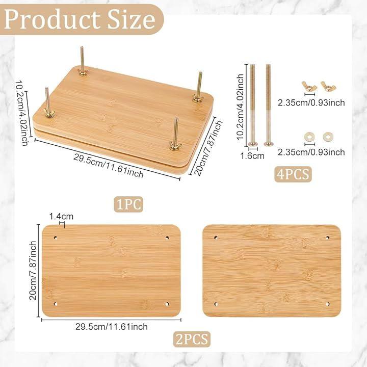 パッケージとサイズ:木製ブックプレスツール1セット;サイズ:約幅200mm、長さ295mm、高さ102mm, 長方形: 295x200x14mm、2個;ネジ:102x23.5x16mm、4個。