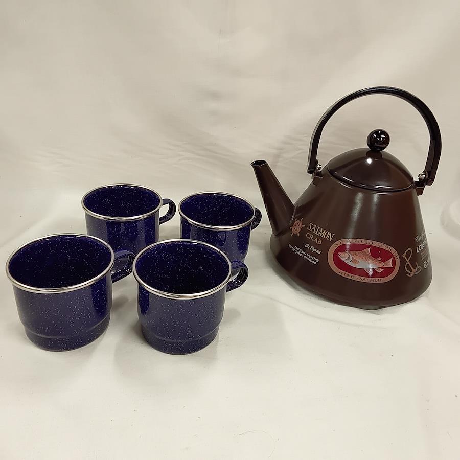 未使用・ホーロー製ケトルX1・ホーロー製マグカップX4です。ケトル中もマグカップもまるで星空の様です。未使用ですが長期保管により経年劣化しているかもしれません。軽くチェックしましたが傷もなく美品です。