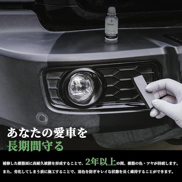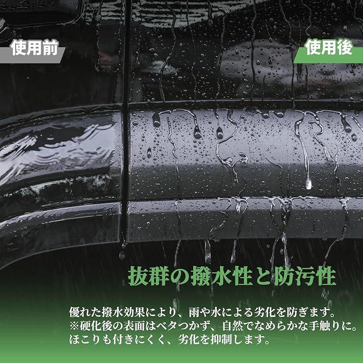 「2年以上耐久性」従来の樹脂コートは一時的に黒艶を出すだけで、雨や洗車によってすぐに効果が失われてしまいますが、本製品は補修した樹脂表面に高耐久セラミック被膜を形成し、紫外線・酸性雨・塩害などさまざまな外的ダメージから樹脂パーツをしっかり保護します。