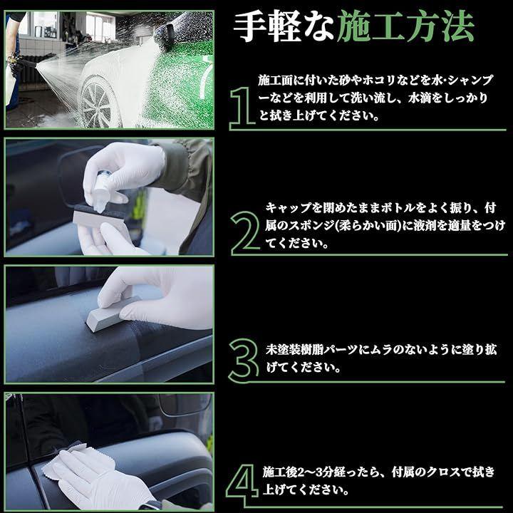 (1)付属のスポンジに液剤をつける(2)未塗装樹脂パーツにムラのないように塗り拡げルる(3)施工2-3分後、付属のクロスで拭き上げる。