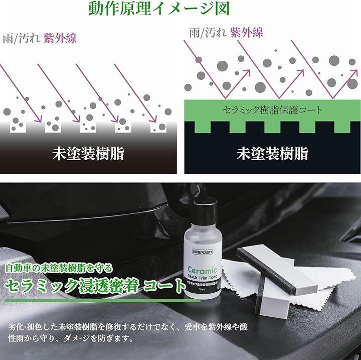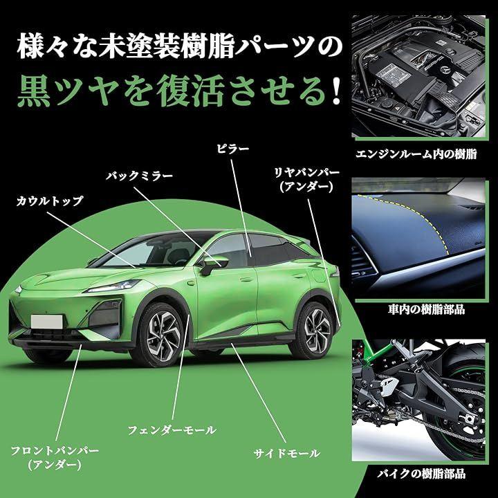 「未塗装樹脂専用ガラスコーティング剤」 未塗装樹脂パーツのためのガラスコーティング剤がついに登場。白く劣化した未塗装樹脂内部へしっかり浸透する高密度タイプで、ムラになりにくく、 白っぽく劣化変色した表面が、新車のような黒々とした表情を取り戻しガラス状皮膜が美しい光沢を与えます。