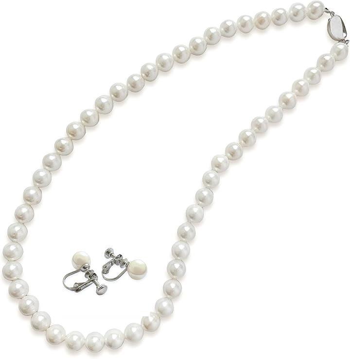 「ネックレス&イヤリングの豪華2点セット」全長約43cmのネックレスと、同じく8mmパールを使用したシルバー合金製イヤリングのセット。