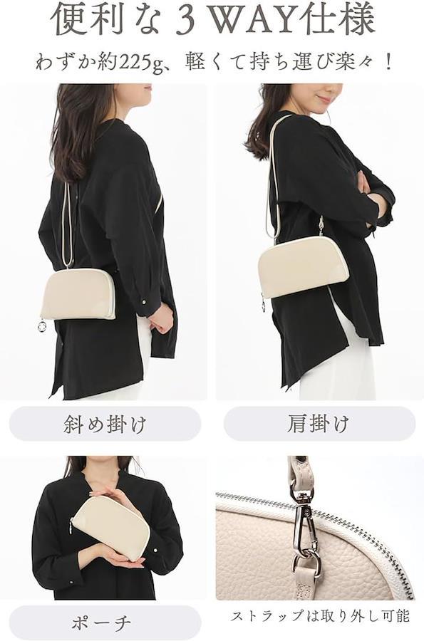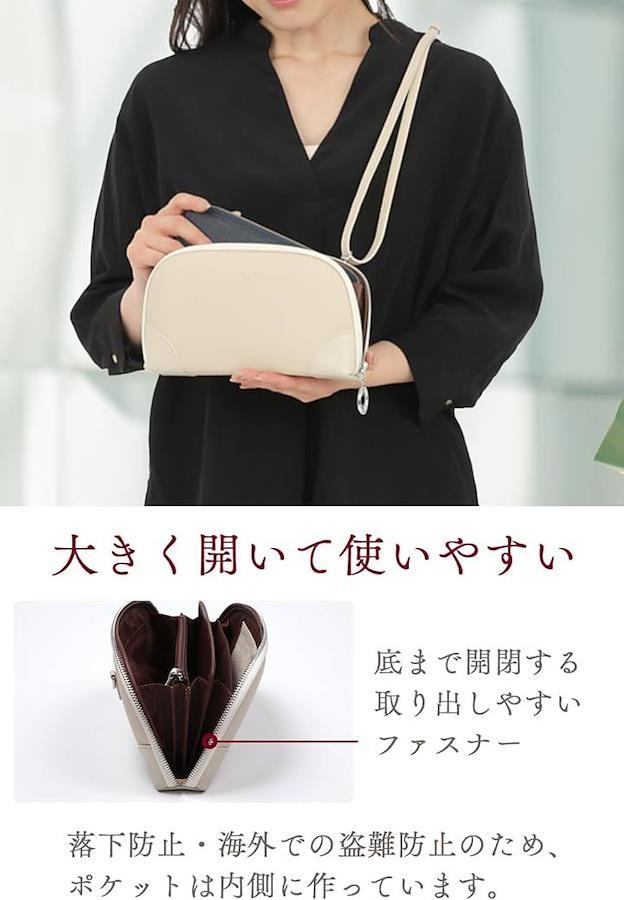 札入れとしても使えるポーチは、斜め掛けや肩掛けは、もちろん、ストラップを外せばクラッチや財布としてもお使いいただけます。