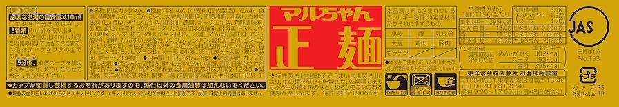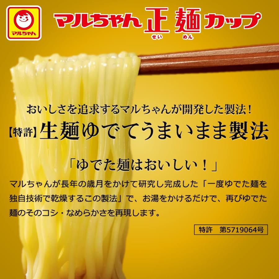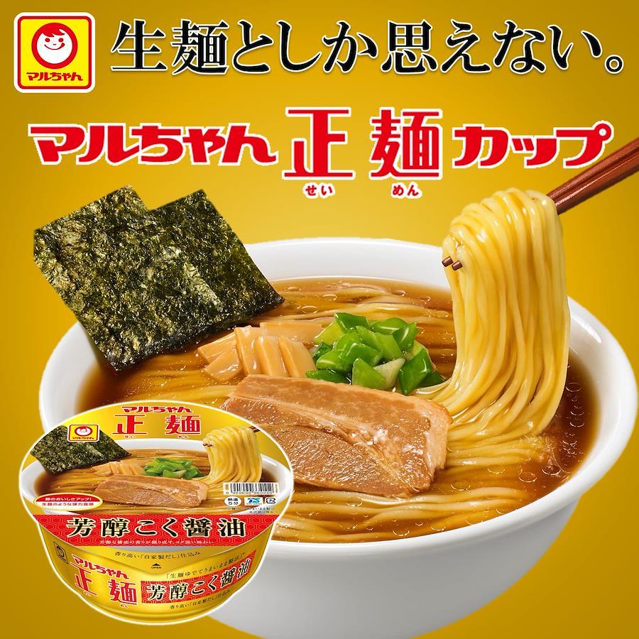 商品紹介 お湯を入れるだけで、いままでにない生麺のような食感と食べ応えを提供する革新的なカップ麺! 生麺のようななめらかな口当たりと、透明感や弾力のある食感が特長の麺。麺重量75g。5分戻し。チキンエキス・ポークエキスをベースに、魚介の風味を加えた、旨みの強い醤油味スープ。自家製のラーメンだしを使用。チャーシュー、ねぎ、メンマ、焼のり。「マルちゃん正麺」ブランドであることをしっかりと伝えながら、カップ麺として重要な「シズル感」を出すことを追求したデザイン。 袋のマルちゃん正麺の根幹となっている「シンプルさ」と「金色」を共通項としながら、ブランドロゴをわかりやすく配置しています。生麺のようななめらかさと弾力のある麺に、ほのかに煮干しを利かせた、旨みの強い醤油スープ。 原材料・成分 めん(小麦粉(国内製造)、でん粉、食塩、植物性たん白、こんにゃく、大豆食物繊維、植物油脂、乳糖)、添付調味料(しょうゆ、チキンエキス、植物油、豚脂、ポークエキス、発酵調味料、砂糖、食塩、香辛料、魚介エキス、たん白加水分解物、酵母エキス)、かやく(焼豚、メンマ、ねぎ、のり、デキストリン)/加工でん粉、調味料(アミノ酸等)、酒精、かんすい、炭酸カルシウム、レシチン、酸化防止剤(ビタミンC、ビタミンE)、増粘多糖類、クチナシ色素、pH調整剤、カラメル色素、香料、ビタミンB2、ビタミンB1、(一部に小麦・卵・乳成分・大豆・鶏肉・豚肉・ゼラチンを含む)