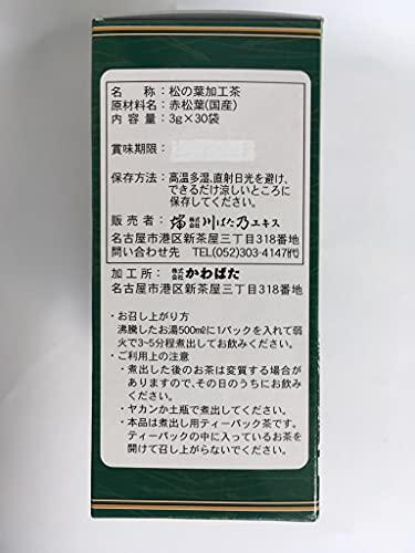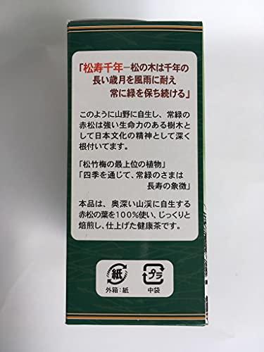 内容量:3gx30袋(ティーパック)本品は、奥深い山渓に自生する赤松の葉を100%使い、じっくりと焙煎し、仕上げた健康茶です。国産赤松葉(三重県産もしくは徳島県産)を使用沸騰したお湯500mlに対して1パックを入れて弱火で3~5分程煮出してお飲みください。ノンカフェイン【重要】メーカーによる商品リニューアルに伴いパッケージ(内容量も含む)変更が行われた場合、新パッケージでお届け致します事ご了承願います。
