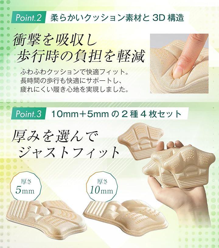 「2種類の厚みであらゆる靴に対応」10mm厚2枚、5mm厚2枚の合計4枚セットで、靴のサイズ調整に便利。