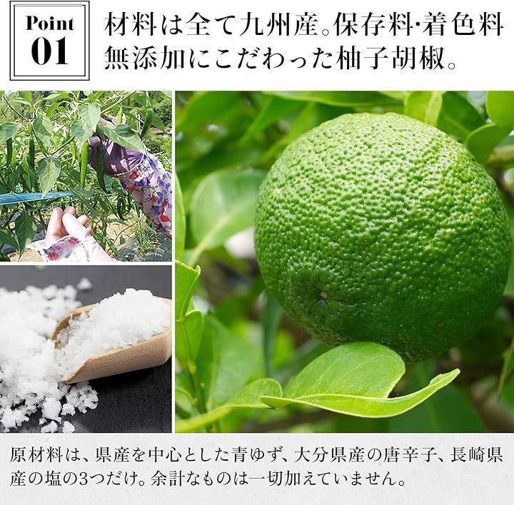 九州産のゆず、長崎県産の塩、大分県産の唐辛子だけを使用した、保存料着色料無添加の柚子胡椒です。
