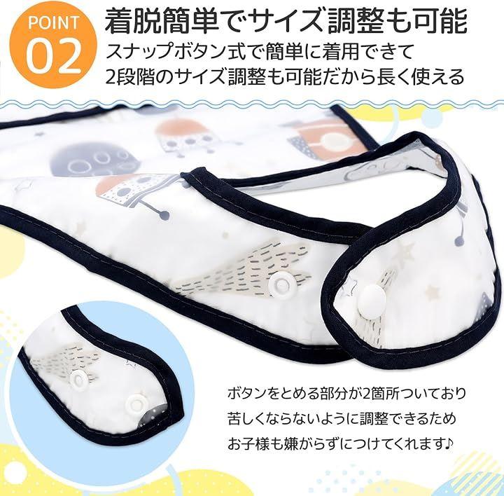「ポケット付き」大きく開くポケット付きなので食べこぼしをしっかりキャッチしてくれます。お出かけ先の食事でもこれ一枚あればきれいに食べられる、汚れてもすぐに拭いて使いまわせるため、効率的です。