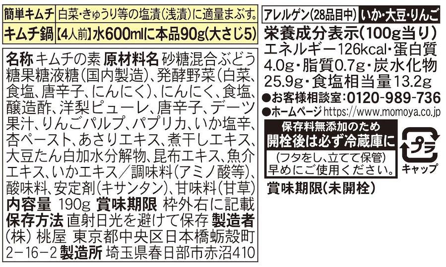 原材料:砂糖混合ぶどう糖果糖液糖(国内製造)、発酵野菜(白菜、食塩、唐辛子、にんにく)、にんにく、食塩、醸造酢、洋梨ピューレ、唐辛子、デーツ果汁、りんごパルプ、パプリカ、いか塩辛、杏ペースト、あさりエキス、煮干しエキス、大豆たん白加水分解物、昆布エキス、魚介エキス、いかエキス/調味料(アミノ酸等)、酸味料、安定剤(キサンタン)、甘味料(甘草)