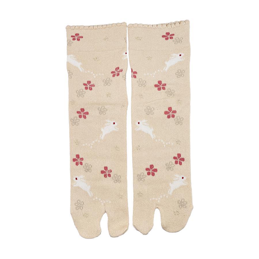 足首を締め付けないゆったり仕様でゴム跡が残りにくくなっています。かわいいウサギがデザインされた女性用足袋型ソックスです。