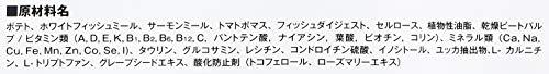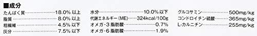 たんぱく質:18.0%以上、脂質:8.0%以上、粗繊維:4.5%以下、灰分:7.5%以下、水分:10.0%以下、代謝エネルギー(ME):324kcal/100g、オメガ-3脂肪酸:0.7%、オメガ-6脂肪酸:1.9%、グルコサミン:500mg/kg、コンドロイチン硫酸:365mg/kg、L-カルニチン:255mg/kg