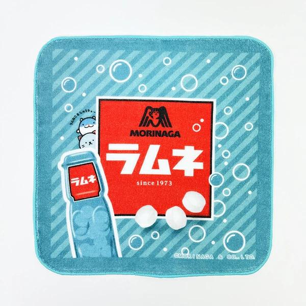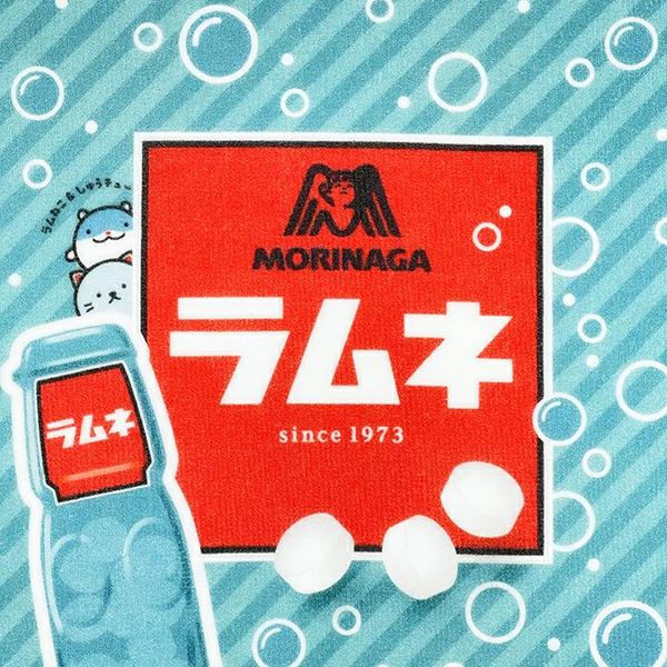 40年以上も愛され続ける、身近なおやつの大定番の「森永ラムネ」身近なハンドタオルに!ひょっこりとラムねこ&しゅうチューがのぞいていてかわいいです。