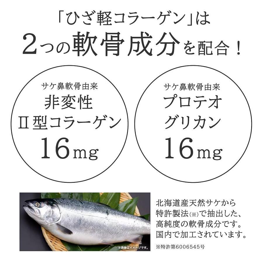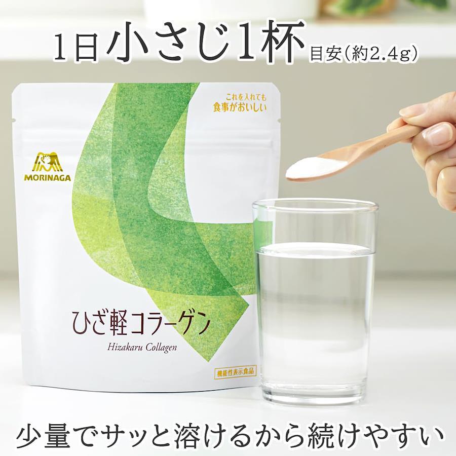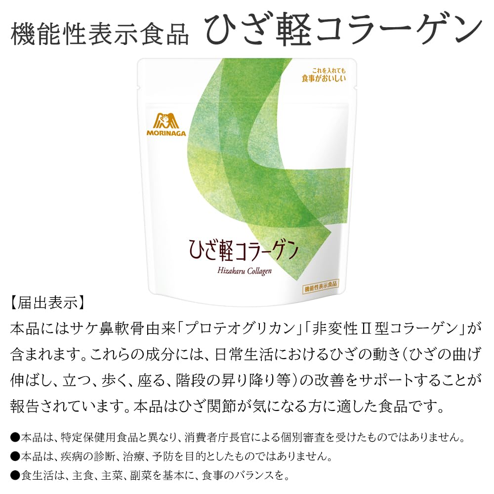 ■サイズ: 「ひざ軽コラーゲン」は、ひざへの機能性が実証された「サケ鼻軟骨由来 非変性Ⅱ型コラーゲン」と「サケ鼻軟骨由来 プロテオグリカン」をWで配合した粉末タイプのコラーゲンです。 毎日お召し上がりいただくことで、ひざの曲げ伸ばし、立つ、歩く、座る、階段の昇り降り等、日常生活におけるひざの動きの改善をサポートします。 「ひざ軽コラーゲン」は、毎日無理なく続けていただけるよう、少ない摂取量とサッと溶けやすい手軽さもこだわりました。1日の摂取目安量は、たったの小さじ1杯(約2.4g)。冷たいものにも溶けやすい微粉砕加工のパウダータイプです。 森永製菓が長年培ってきた技術で、原材料のクセやにおいを低減。お料理や飲み物に混ぜても味や香りをそこなわず、毎日の食事の中でおいしく続けていただけます。 「ひざ軽コラーゲン」は、1食分(2.4g)当たり9kcalに抑えています。さらに、コレステロールゼロです。