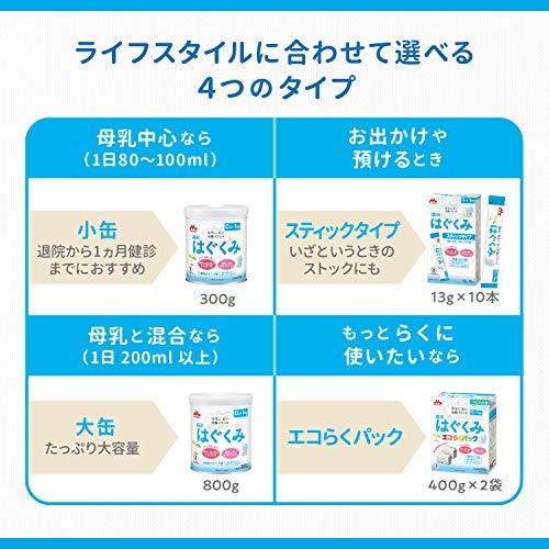 0ヶ月の新生児~1歳頃までのベビーミルク はぐくみは、全国の産婦人科でも使われている粉ミルクです。入れかえタイプで400gごとに小分けパックされた「エコらくパック」、たっぷり使える「大缶」、母乳と混合の方に便利な「小缶」、お出かけや夜間の調乳にも便利な「スティックタイプ」をラインアップ。離乳食にも活用できます。 ミルクを作る前には、手を洗い、器具(哺乳瓶や、哺乳瓶ブラシなど)は消毒して使いましょう。専用のスプーンで正確にはかりましょう。1回ごとに調乳して飲ませてあげてください。作り置きや飲み残しは与えないでください。