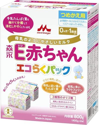 0ヶ月の新生児~1歳頃までのベビーミルク E赤ちゃんは、全国の産婦人科でも使われている粉ミルクです。入れかえタイプで400gごとに小分けパックされた「エコらくパック」、たっぷり使える「大缶」、母乳と混合の方に便利な「小缶」、お出かけや夜間の調乳にも便利な「スティックタイプ」をラインアップ。離乳食にも活用できます。 ミルクを作る前には、手を洗い、器具(哺乳瓶や、哺乳瓶ブラシなど)は消毒して使いましょう。専用のスプーンで正確にはかりましょう。1回ごとに調乳して飲ませてあげてください。作り置きや飲み残しは与えないでください。