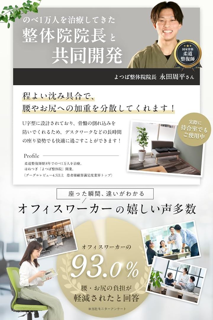 「整体院院長との共同開発」 整体院院長との共同開発により、骨盤補正クッションや姿勢補正クッションとして、お尻が痛くならない、快適で健康的な座り心地を実現しました。