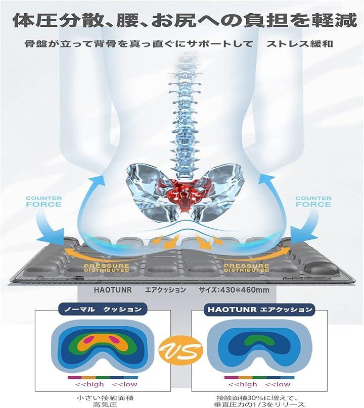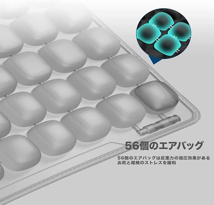 「優れた体圧分散効果」56個のエアバッグ内で全体に行き渡り、臀部への圧力を3分の1以上低減し、均等に分散されて体圧を緩和し、体圧を効果的に分散させ快適な座り心地を実現します。