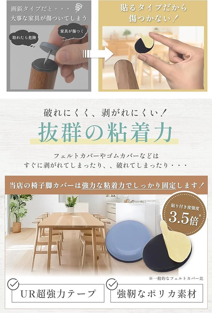 「シールをはがしてペタッと貼るだけ。」取り付けはとっても簡単。シールの裏紙をはがして、椅子の脚裏に貼るだけでOK。