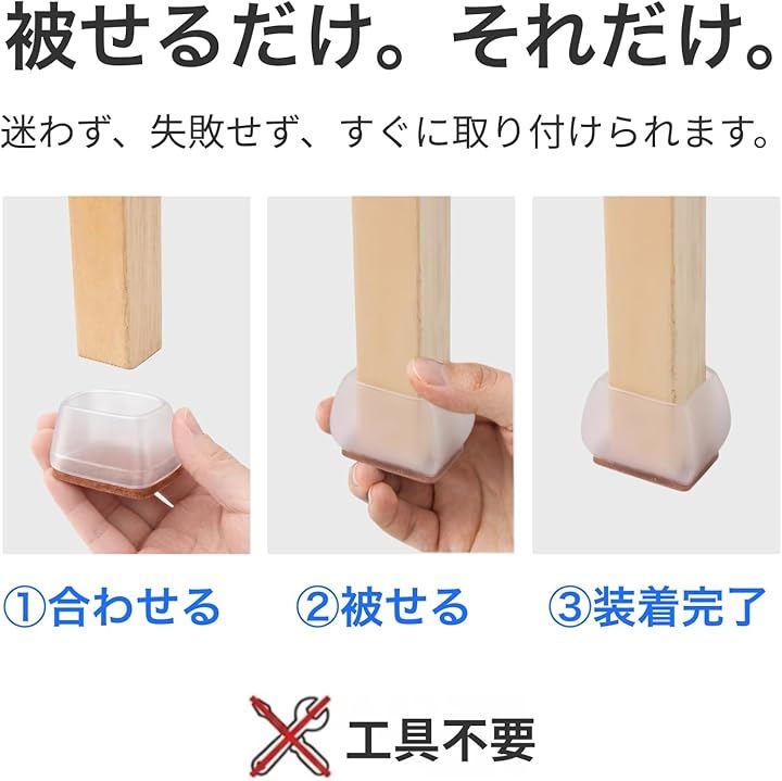 椅子の足被せる足カバーとして、キャップ形状で装着でき、家具スライダーのように床を傷つけにくい構造です。