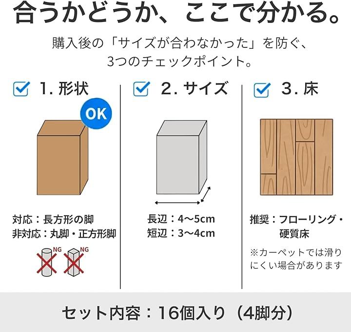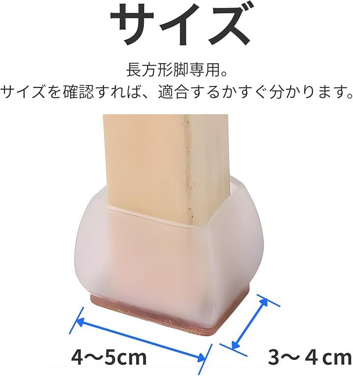 「長方形・角脚に合わせた専用設計」 長方形・四角形の脚に対応した角型仕様で、大きめサイズの椅子にも合わせやすい設計です。