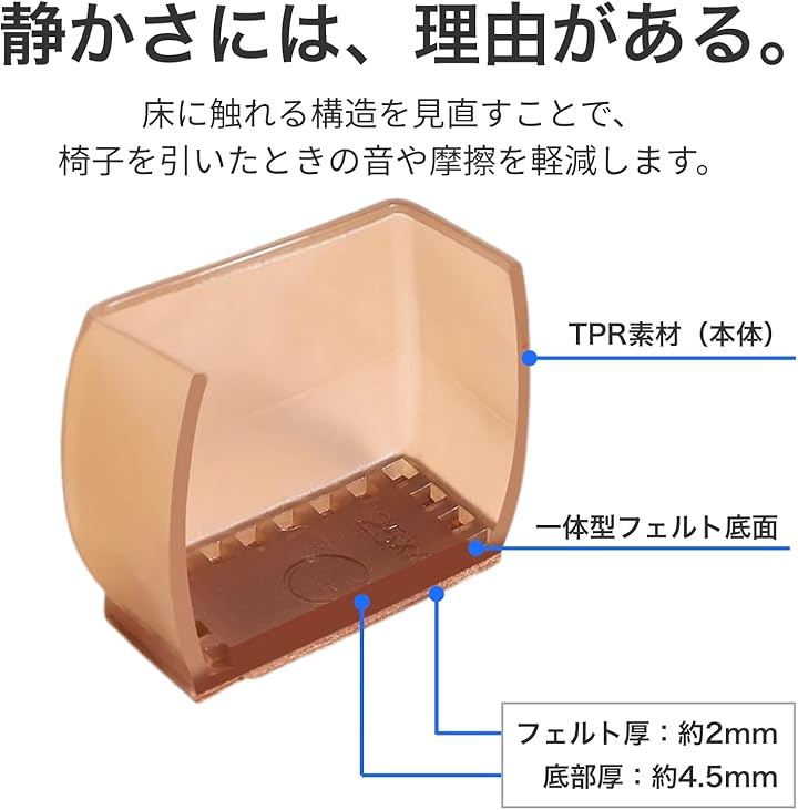 「厚底フェルトで、静かさと床保護を両立」 底面にはフェルトパッドを組み合わせた厚底構造を採用しています。