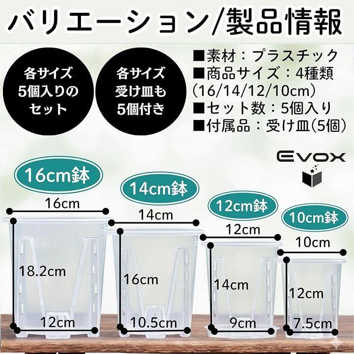 「本体サイズ/商品詳細」*10cm鉢:口径10cm、底径7.5cm、高さ12cm、土容量0.4L *12cm鉢:口径12cm、底径9cm、高さ14cm、土容量0.8L *14cm鉢:口径14cm、底径10.5cm、高さ16cm、土容量1.3L *16cm鉢:口径16cm、底径12cm、高さ18.2cm、土容量2.0L *内容:5個入り *付属品:底皿(受け皿)5個付き