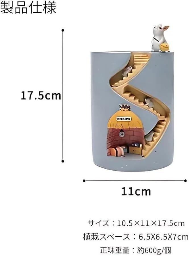 「製品仕様」サイズ:高さ17.5cmx直径11cm 穴部分:深さ6.5cmx直径7cm 重量:600g 素材:樹脂 使用用途:植木鉢、多肉植物ポット、ペンスタンドなど