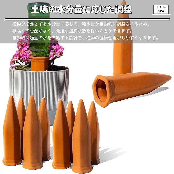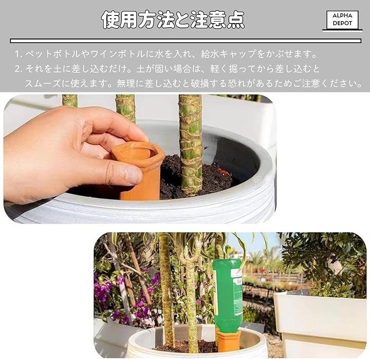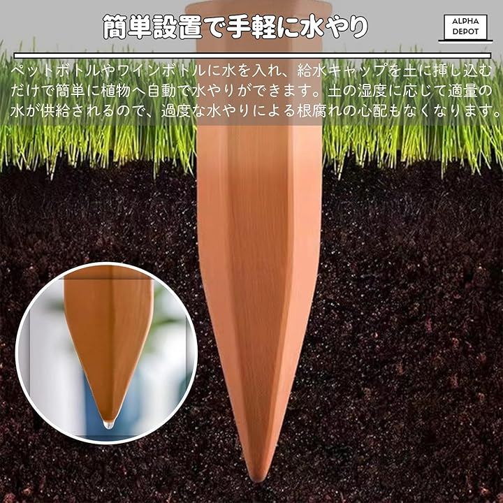 「簡単設置で手軽に水やり」ペットボトルやワインボトルに水を入れ、給水キャップを土に挿し込むだけで簡単に植物へ自動で水やりができます。