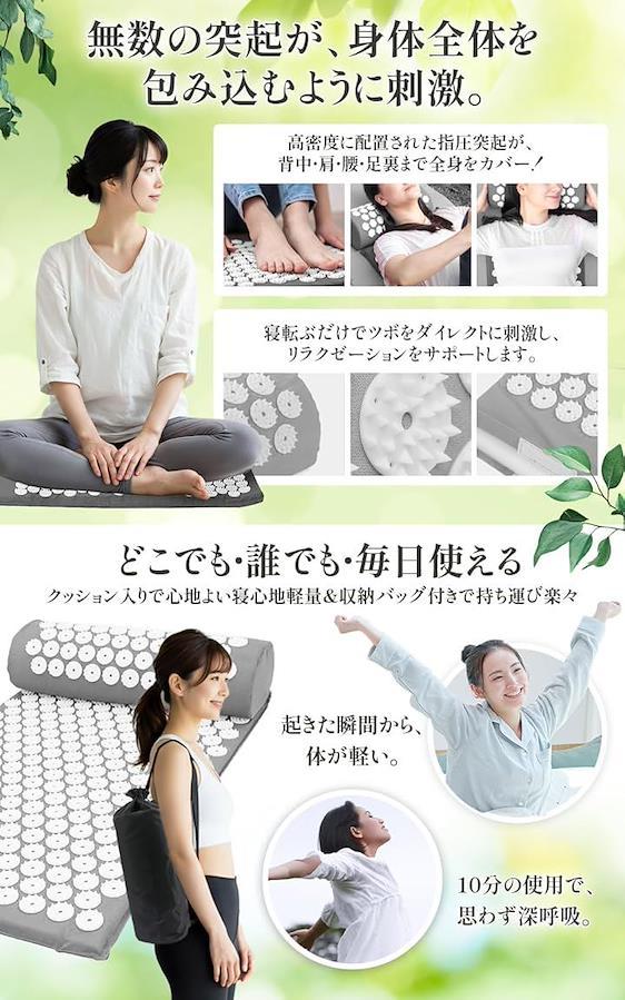 マットにびっしりと並んだ指圧ポイントが、体に心地よい刺激を与えて、ゆったりとした時間へ導きます。