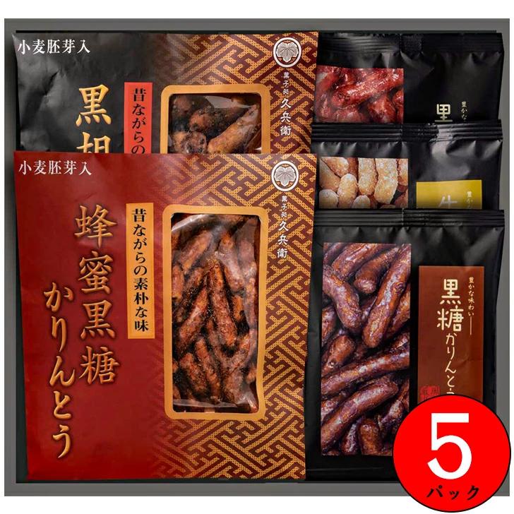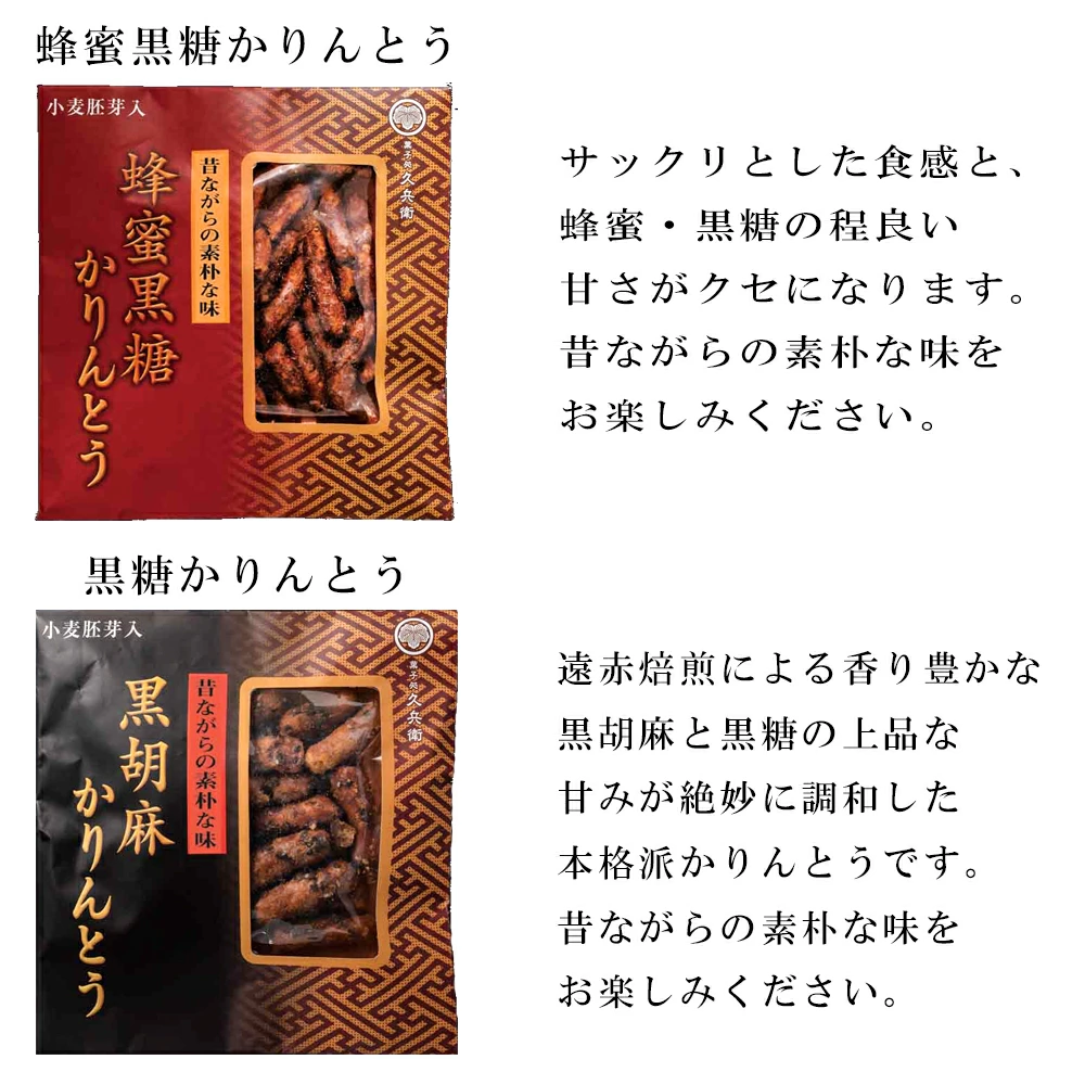 久兵衛黒胡麻かりんとう45g、久兵衛蜂蜜黒糖かりんとう45g、黒糖かりんとう15g、黒胡麻かりんとう15g、牛乳かりんとう15g、