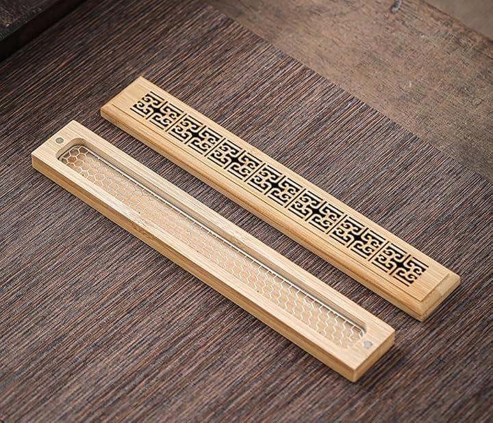 デザイン性: 伝統的な和風の透かし彫り模様が施された木製お香立て、3種類の異なる模様からお選びいただけます