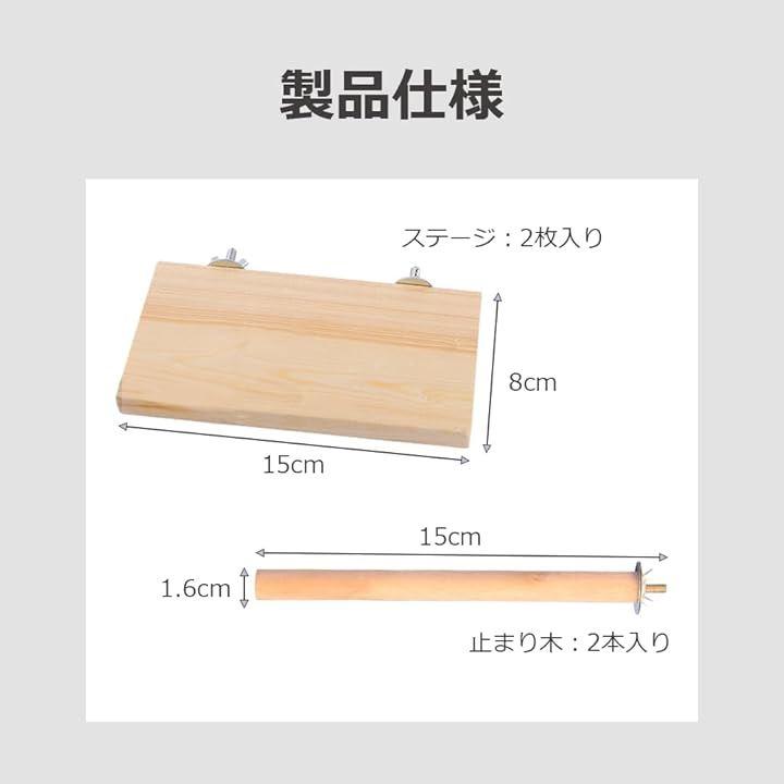 「製品仕様」「止まり木寸法」直径1.6cm 長さ15cm 「足場寸法」15cm x8cm