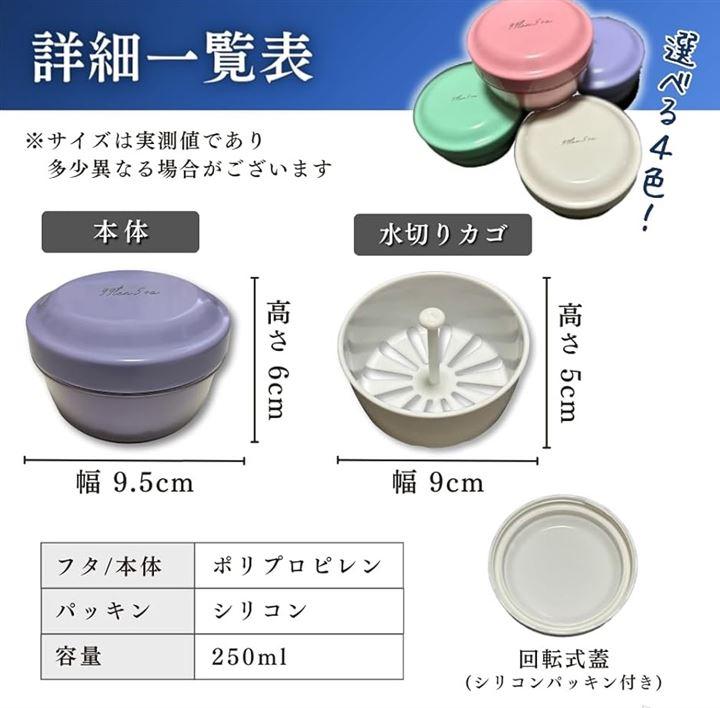 つまり洗浄剤で洗う為に必要な水分量を確保する事ができます しっかり洗う事で虫歯、口臭などの予防につながります「歯科衛生士監修」 便利な水切りカゴで乾燥させる事ができます 水切りカゴがあるので中身が見えません またシンプルな構造で老若男女問わず使用できます「毎日清潔に使いたいあなたへ」 密閉した状態で洗浄剤の使用ができます ケースも丸ごと洗えます なので毎日清潔に使うことが出来ます「デザイン性」 洗面所になじむデザインです蓋を閉めると中身が見えません カラーはパステルカラーの4色から選べます マウスピースケース、部分入れ歯ケース、インビザライン、リテーナーケース、ナイトガードなどに活用できます