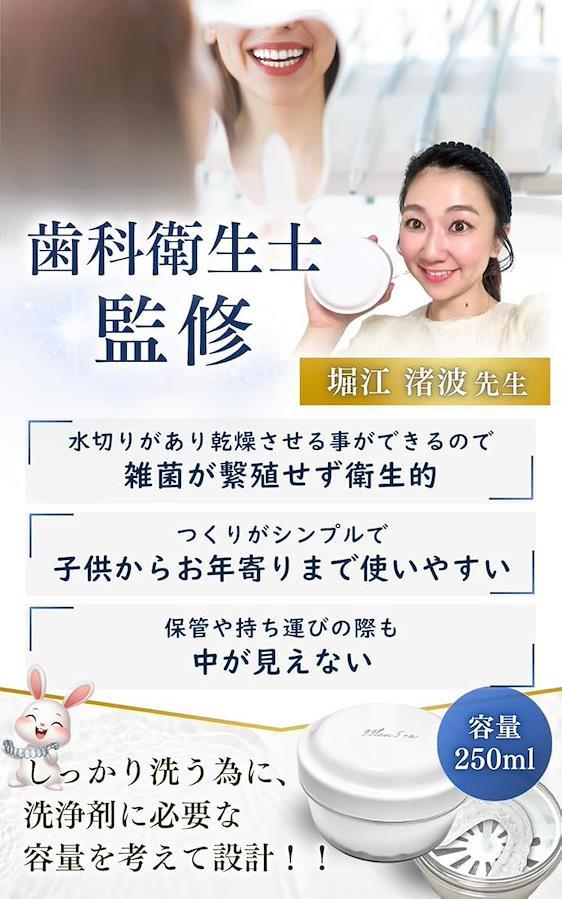 矯正、審美、スポーツ、いびき、ナイトガードなど各種マウスピースや部分入れ歯などに活用できます 特長としてはしっかり洗える事です それによって構内環境を清潔に保つ事ができます 他には、水切りカゴ、中身が見えない設計、パステルカラーな4色などの特長もあり 洗面所にそのまま置いておいても良くなじむ設計としています。 水量は250ml入るので洗浄剤を入れてしっかり洗うことが出来ます しっかり洗えるので口内環境を清潔に保つ事ができます 毎日使うからこそ清潔に <注意> 総入れ歯に関してはサイズ上使用不可となります ご購入に際しサイズを記載していますので予めご確認いただけますと幸いです