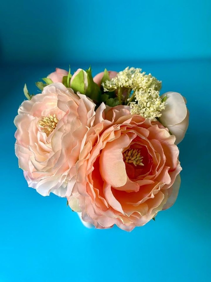 パールピンクとサーモンピンクのピオニーが優雅に咲き誇る、華やかなアレンジメントです。
