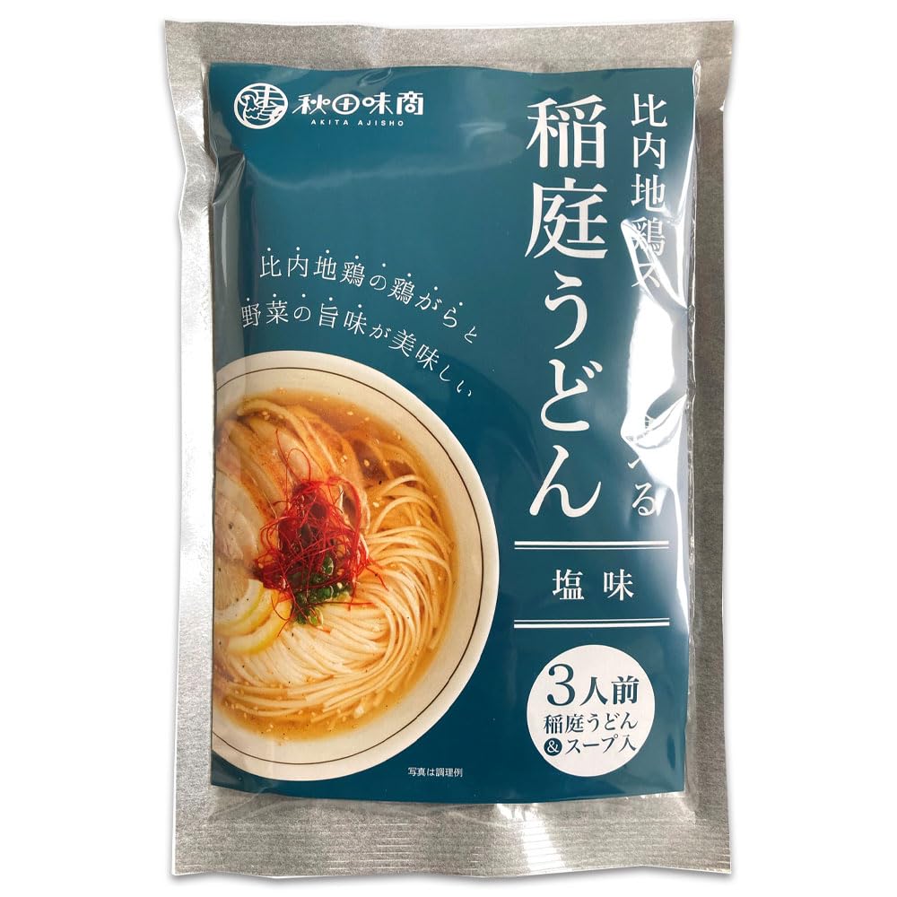 うどん:小麦粉、でん粉、食塩 スープ:比内地鶏エキス、チキンエキス、しょうゆ、たん白加水分解物、食塩、野菜エキス、かつおエキス、調味料(アミノ酸)、加工でん粉、酒精、酸化防止剤(ローズマリー抽出物)、原料の一部に小麦、大豆を含む 内容量:うどん300g、スープ57g×3