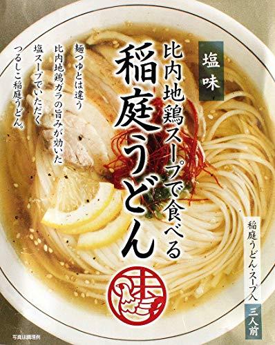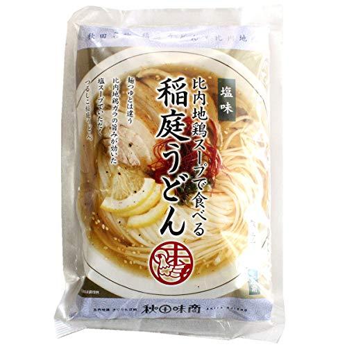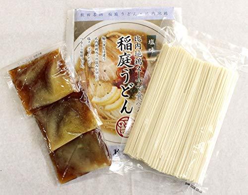 うどん:小麦粉、でん粉、食塩 スープ:比内地鶏エキス、チキンエキス、しょうゆ、たん白加水分解物、食塩、野菜エキス、かつおエキス、調味料(アミノ酸)、加工でん粉、酒精、酸化防止剤(ローズマリー抽出物)、原料の一部に小麦、大豆を含む 内容量:うどん300g、スープ57g×3