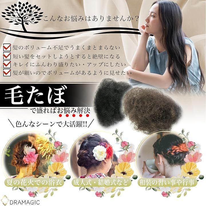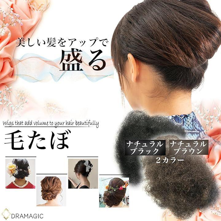 「和装以外でも」普段使いではお団子の中に入れてボリューム感を出すなど、ご利用シーンは様々す。結婚式やパーティーなどでドレス・洋服着用時、毛たぼで髪を盛ってスタイルアップ。またウィッグを使う人、ウィッグをかぶる時など隙間を埋めて調整などもできちゃいます。