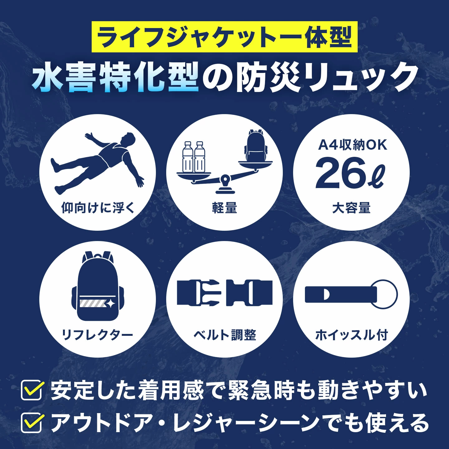仰向けに浮く設計で顔の水没を防ぎ、約26Lの大容量に防災グッズを収納可能。