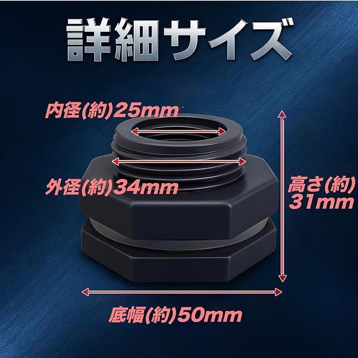 「詳細サイズ」使いやすさと互換性に配慮 ‧高さ:約31mm ‧底幅:約50mm ‧メスネジ内径:約25mm/外径:約34mm(G3/4規格) ‧対応タンク厚:約8mm カラー:ブラック|材質:PVC‧シリコン|セット数:4個