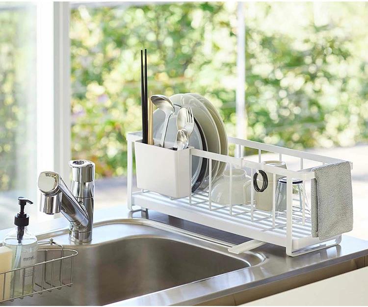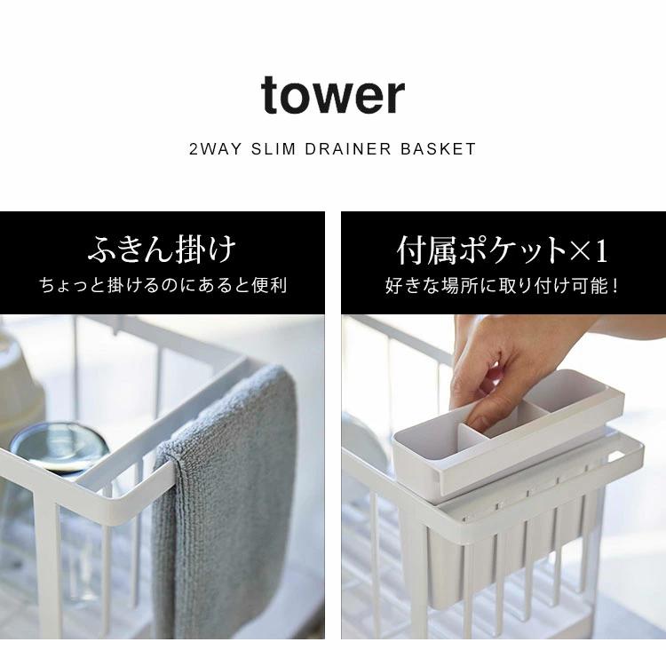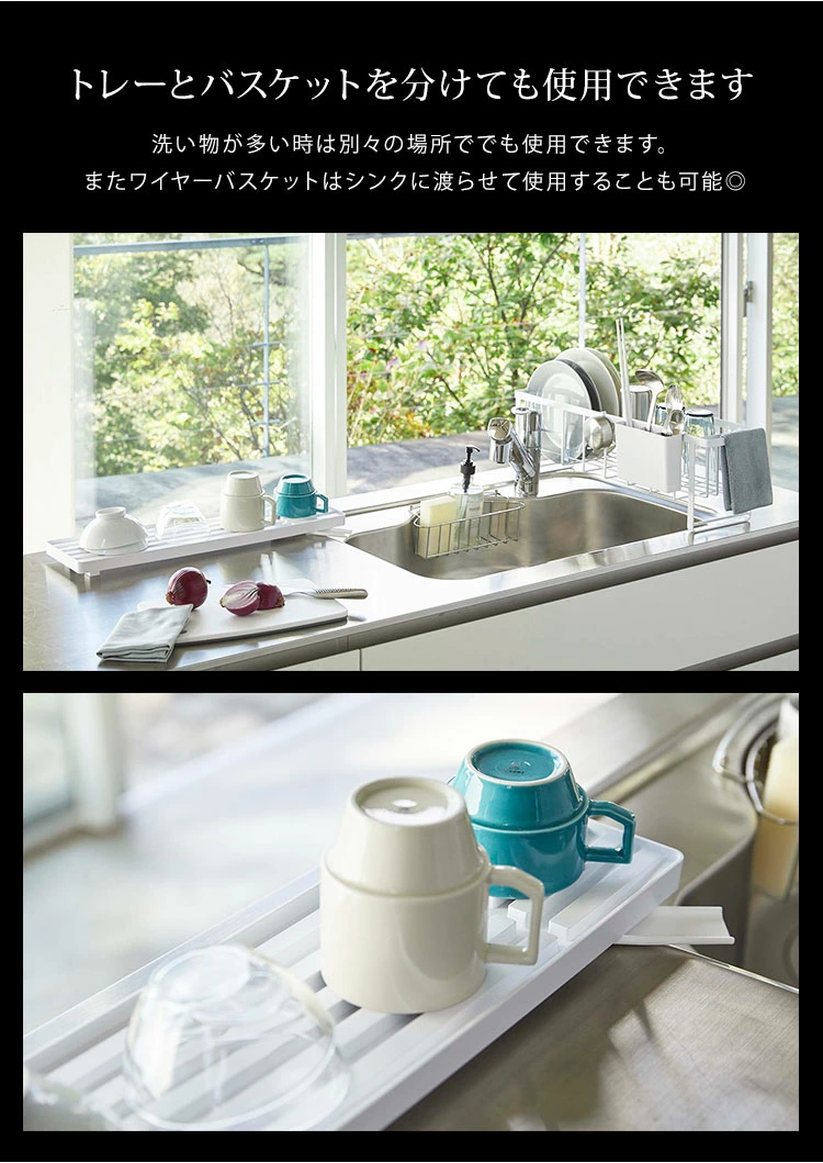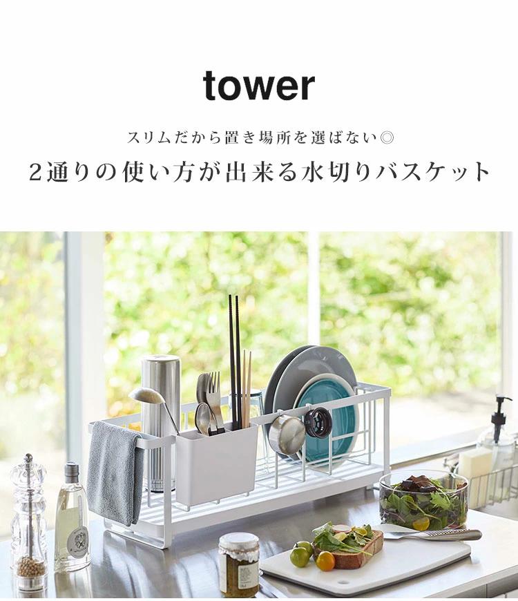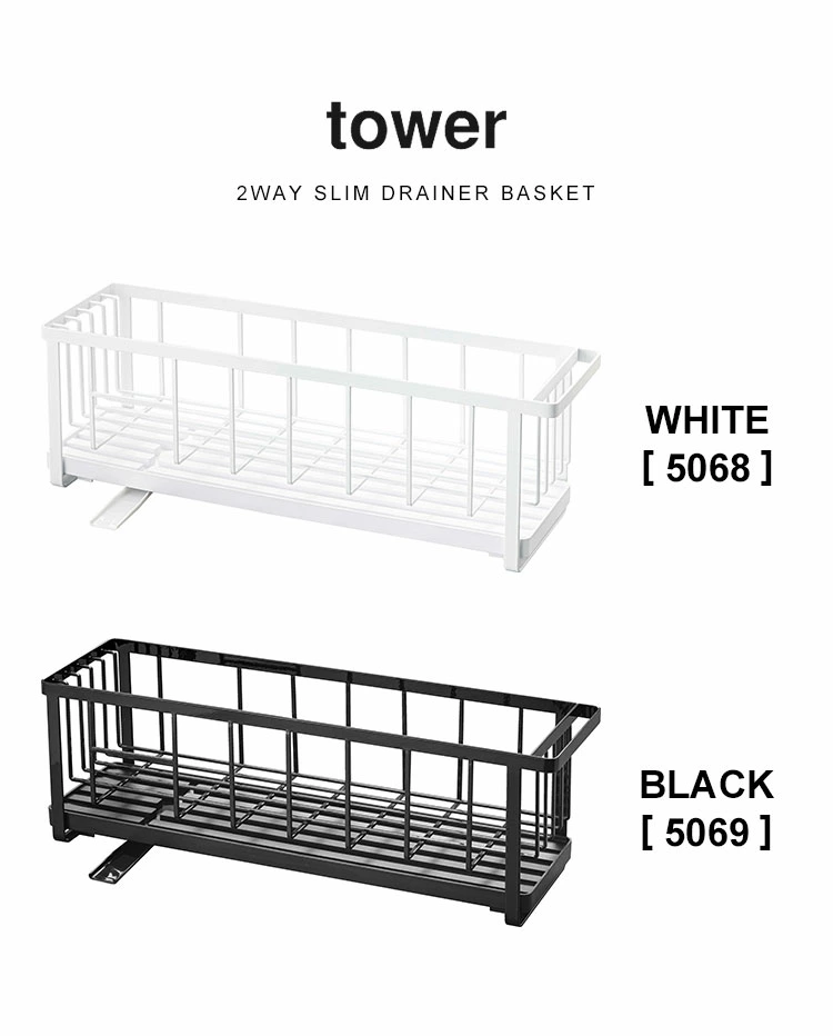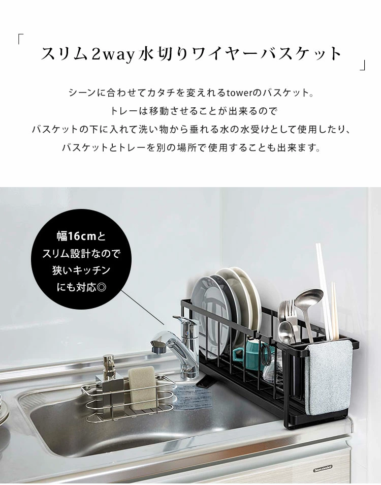 【スリムツーウェイ水切りワイヤーバスケット】丁寧な暮らしをするおしゃれさんたちにお届けする、シンプルながらもアイデアのつまったtowerシリーズ。シーンに合わせてカタチを変えれるtowerのスリム水切りワイヤーバスケット。水切りトレーは本体から取り外せるので別々に使用することも可能な2way。幅16cmとスリムなのでスペースの少ないキッチンでも邪魔になりません◎