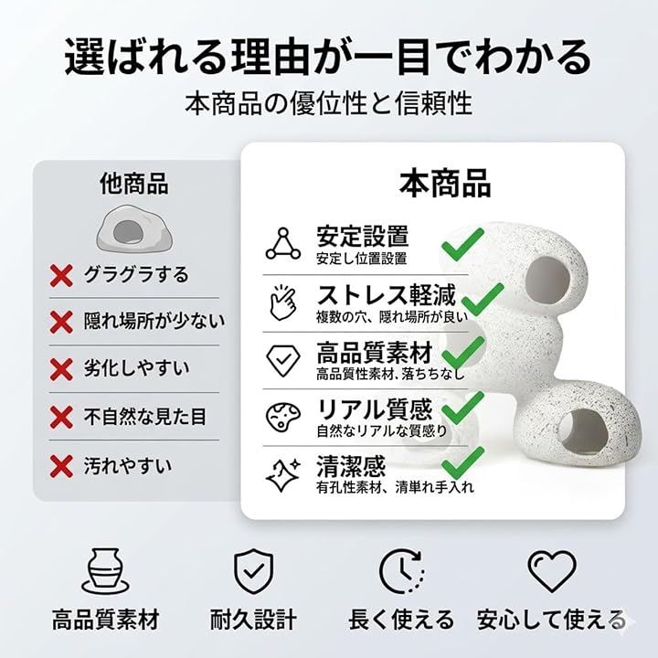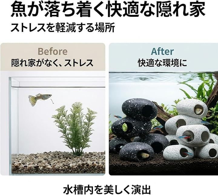 「生体のストレスを軽減する隠れ家」 ほどよいサイズの穴が複数空いており、魚たちがホッと落ち着けるシェルターとして機能します。