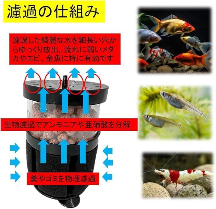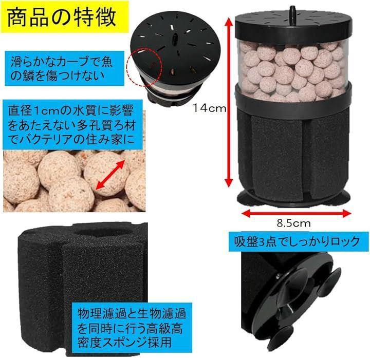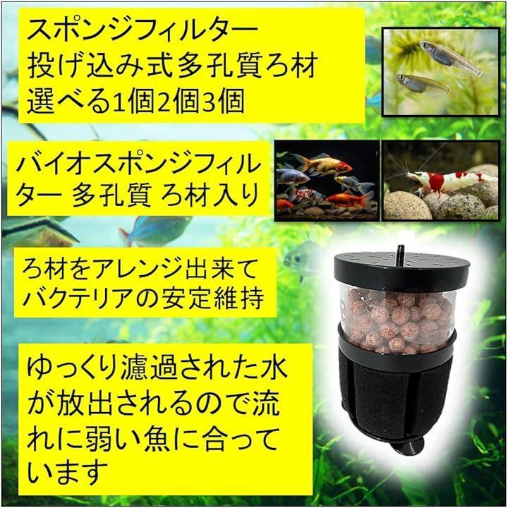 「選べる個数1個 2個 3個」投げ込み式 スポンジフィルター+多孔質ろ材付き 濾過器 販売 。 「濾過性能」スポンジフィルターの物理濾過、多孔質ろ材の生物濾過でアンモニア、亜硝酸を分解して水質安定